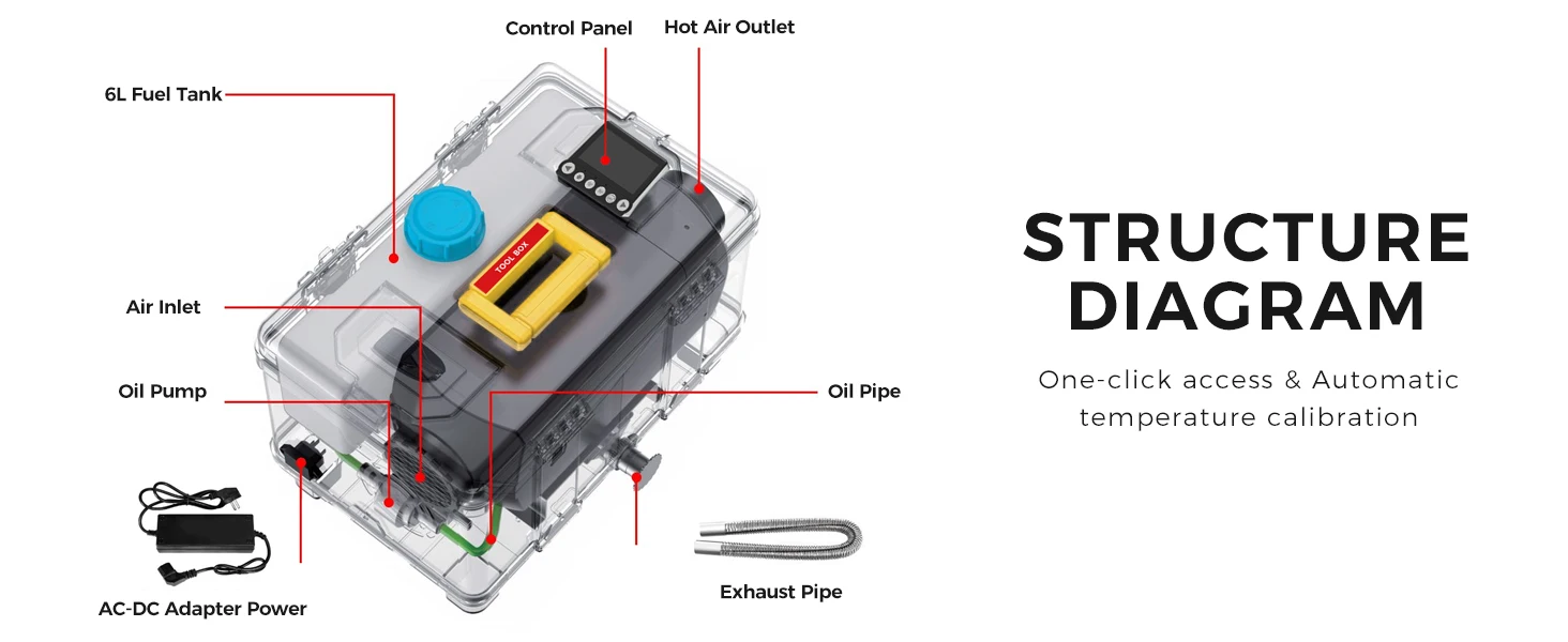 SUNSTER Toolbox TB10 Diesel Air Heater is designed to provide an efficient, peaceful, and convenient heating experience, allowing you to easily bid farewell to the cold winter. It can provide stable heating within 10 minutes with one click direct access, ultra quiet constant temperature operation, and can be used in high-altitude areas above 4500 meters. It can automatically adjust fuel output and display altitude according to altitude, creating a warm and comfortable space for your car, camper van, truck, indoor, etc., meeting your more camping and adventure needs, making your travel feel safe and enjoyable!